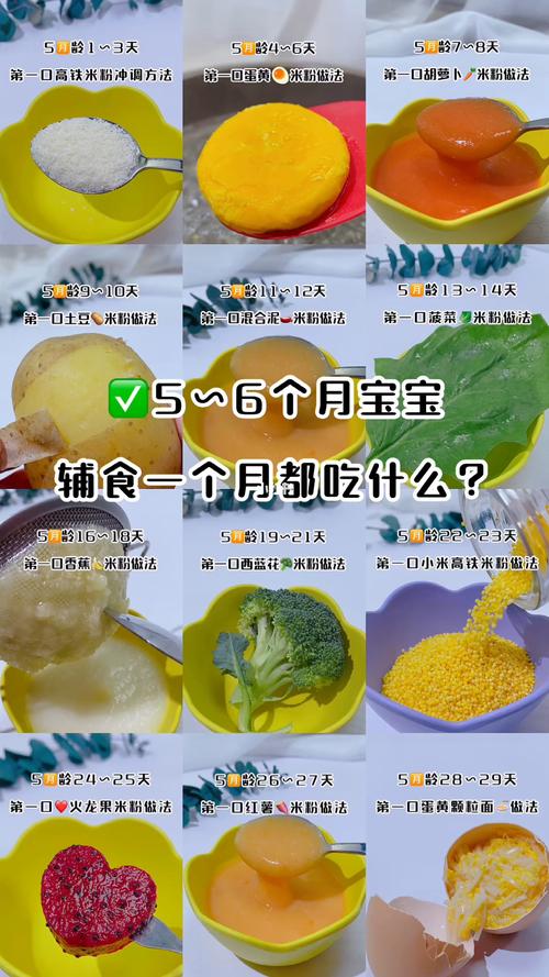 母乳或配方奶:仍应作为主要营养来源。果泥:富含营养,可从单一水果开始,如苹果、香蕉、梨或浆果。蔬菜泥:从软蔬菜开始,如胡萝卜、红薯、南瓜或西兰花。米糊:由强化大米制成,富含铁和维生素,可作为母乳/配方奶的补充。自制辅